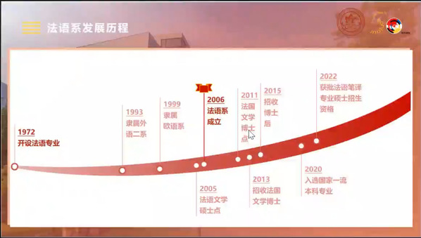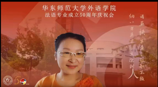 庆祝活动的下半场,法语系系主任金桔芳承接系史回顾,首先,从法语系发展历程、师资队伍、卓越人才培养、国际交流与合作、就业倾向五个方面对法语系发展的现状进行了介绍,并提出:如何适应新时代国家人才培养的需要,如何在新文科的背景下以及国际国内高校的激烈竞争中保持长远的发展,这是新形势对法语系未来的建设与发展所提出的挑战。
