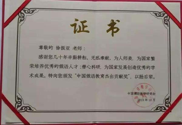 2006年徐振亚教授获俄罗斯作家协会颁发的高尔基奖。2007年退休后,徐教授仍然笔耕不缀,在台湾中国文化大学任客座教授一年。