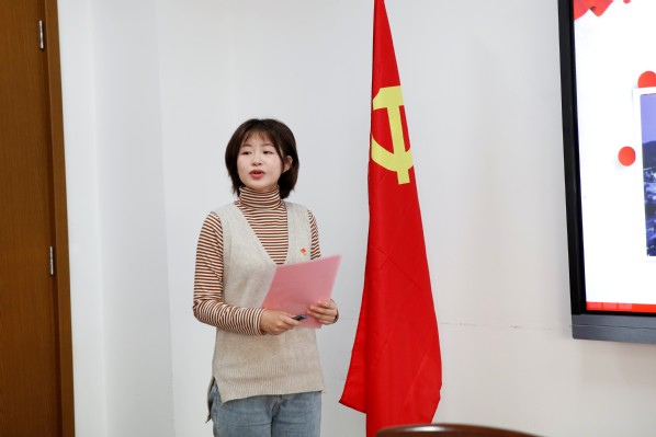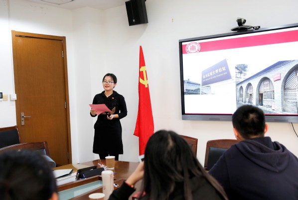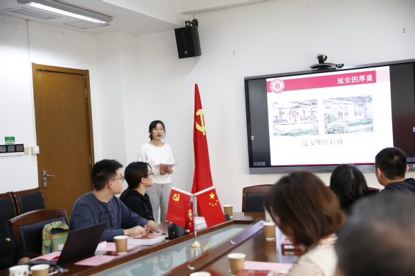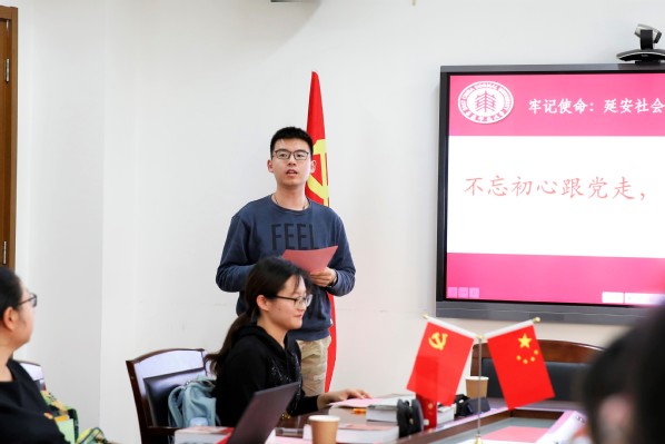 延安子长红色翻译社会实践负责人、2018级学术型研究生牛子杰则分享了他作为一名入党积极分子延安之行的感受。牛子杰同学表示,老一辈革命家们自力更生、艰苦奋斗的精神着实令人震撼,这一次红色纠译之旅让他对“不忘初心、牢记使命”有了更深层的认识,让他时刻牢记为人民服务的宗旨,更加坚定了向组织靠拢的决心。牛子杰同学的分享让在场党员回忆起自己申请入党时迫切向党组织靠拢、成为一名党员时庄严地向党旗宣誓的情景,启发大家探究自己成为一名中共党员的初心。