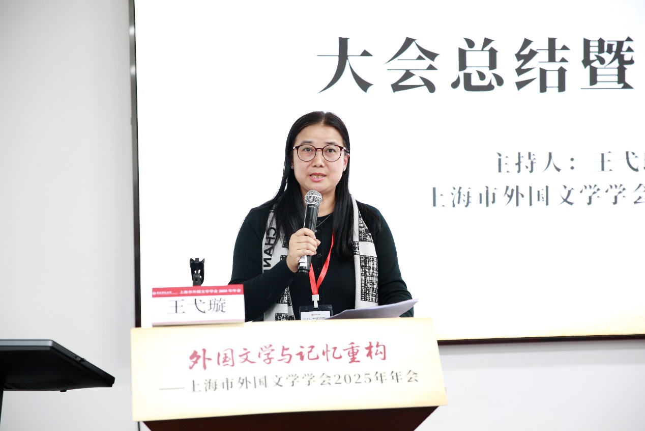 王弋璇秘书长总结了会议的两个关键词:精彩纷呈、温暖热烈。她认为本次会议具有高度开放性和互动性,见证了学术共同体的密切交流,并重点感谢上海市社联和两家出版社对本届年会的大力支持。最后,王弋璇秘书长概括说本次会议将鼓舞上海市外国文学界的学者们以本土性为根基、对话性为桥梁、创造性为引擎,共同书写“外国文学与记忆重构”研究的新篇章。