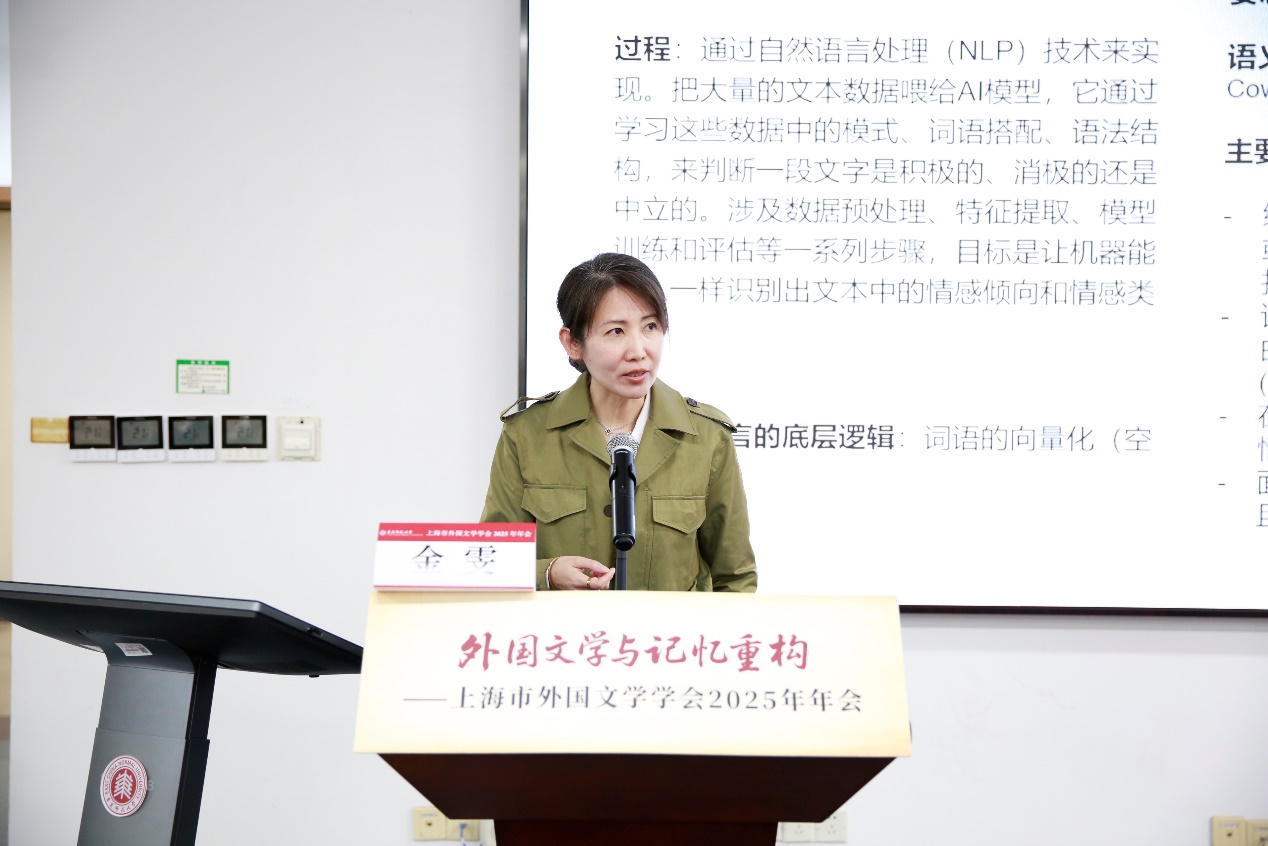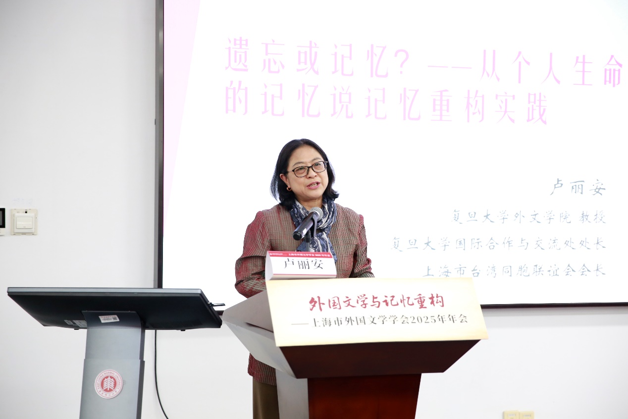 副会长、复旦大学卢丽安教授在她题为《遗忘或记忆?——从个人生命中的记忆说记忆重构实践》的报告中,结合家族史与记忆理论,指出记忆不仅是个人认知的基础,更是构建集体认同与文化共识的纽带。她聚焦两岸关系,呼吁挖掘与重构被遗忘或被沉默的历史,促进情感联结与文化认同。她特别强调,在中国的外国文学教学与研究场域,学术工作与记忆构建之间有着深厚的内在联系,记忆研究不仅是理论探讨,更是连接历史与当下、学术与社会的桥梁。