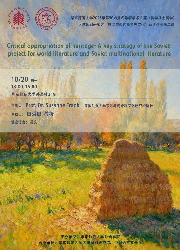 10月20日下午,h动漫 ”2025年第90场知名学者讲座“在h动漫 319会议室举行,主讲人是苏珊·弗兰克教授、博士(Prof. Dr. Susanne Frank),来自德国洪堡大学东欧与匈牙利文化研究所,讲座题目为《批判性地适用文化遗产:苏联多民族文学发展与世界文学概念的界定与策略》,讲座由田洪敏教授主持,来自本校h动漫 、中国语言文学系的老师与青年学子,以及上海师范大学中国语言文学系的博士生、本科生参加了本次的活动,并互动交流。