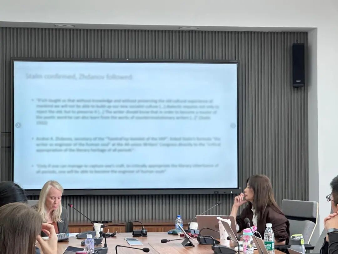 交流环节,主持人田洪敏教授评议指出,在“national literature”与“international literature”之间,可以清晰地界定俄苏文化在1930年代对于“世界文学遗产”的整合观念。该研究为理解文学经典的形成、文化权力的运作以及“世界文学”概念的历史性提供了极具启发性的分析框架。现场博士生研究生杨健强、窦晓菲等则围绕《文学批评》期刊的真实角色、文化“适用”与“挪用”的理论区分、以及相关文学遗产在后苏联时代的命运等问题与主讲人展开了热烈讨论。