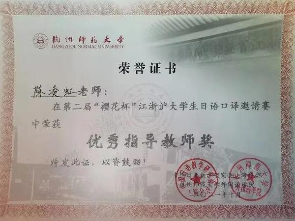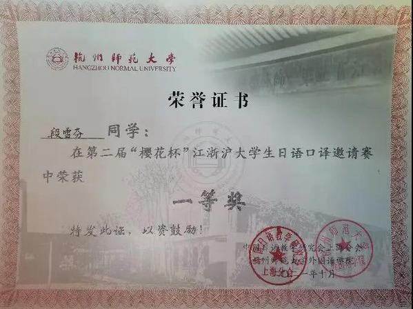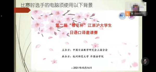 2021年10月16-17日,在中国日语教学研究会上海分会主办、杭州师范大学承办的第二届“樱花杯”江浙沪大学生日语口译邀请赛上,h动漫 日语系2018级本科生段雪芬同学以出色的表现和优异的成绩斩获一等奖,日语系陈凌虹老师获得优秀指导教师奖。