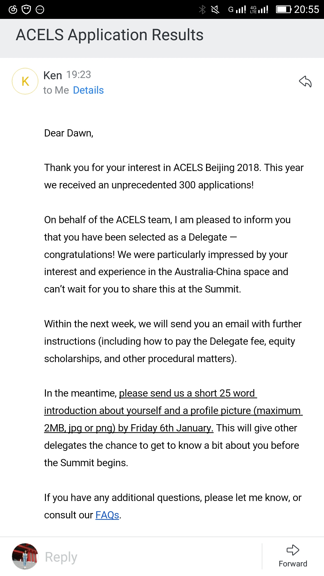 另据刚收到的消息,我中心研究生陈曦在300名申请者中脱颖而出,成功入选2018年中澳青年联合会(ACYA)2018年中澳青年领袖发展峰会(ACELS),将代表h动漫 澳大利亚研究中心参加本次旨在促进中澳青年杰出人才交流合作的重要活动。