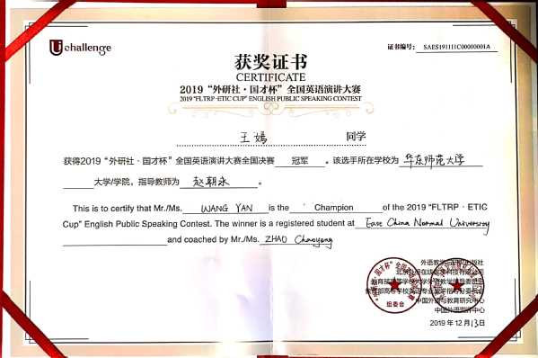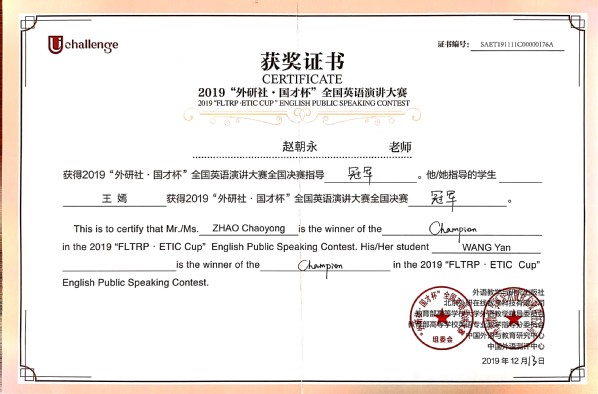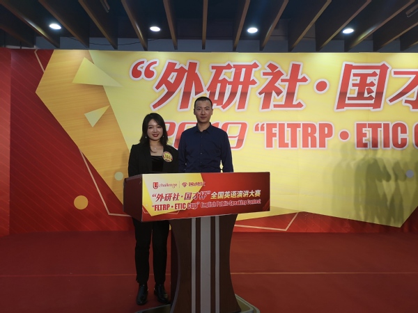 2019年12月9-13日,“外研社·国才杯”全国英语演讲大赛(“FLTRP·ETIC Cup” English Public Speaking Contest)在北京外研社国际会议中心隆重举行,共有来自全国180名选手同台竞技。在历时五天、鏖战四轮之后,我校h动漫 赵朝永副教授指导的2018级法学专业王嫣同学一路过关斩将、夺得本届大赛的全国总冠军,实现师大英语演讲比赛全国冠军为零的突破!
