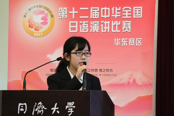 本次演讲比赛分为上下两个半场,在上午的比赛中,选手们分别以“增进中日相互理解——我之所想,我之所为”或“我要创办的企业”为题发表演讲。陶紫东同学讲述了自己希望成为一名国际记者,为中日两国人民的交流和相互理解而努力的志愿。她以标准的日语发音、独特的视角及深刻的内容给评委及全场观众留下了深刻的印象。在下午的比赛中,围绕“在老龄化社会中机器人的作用”这一话题,陶紫东同学发表了即兴演讲。内容充实,角度新颖,表达流畅,迅速征服了在场所有人,赢得了大家的阵阵掌声。