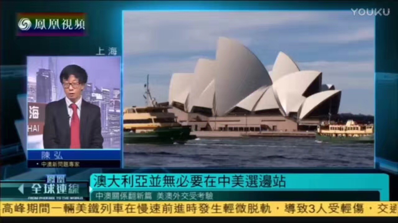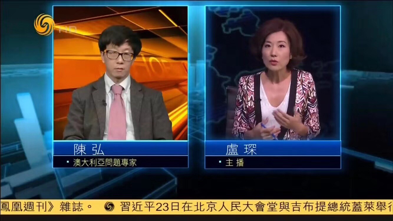 17)11月23日,凤凰卫视中文台《凤凰全球连线》采访陈弘,陈弘就澳大利亚政府2017年外交政策白皮书中澳大利亚自我定位、涉南海问题言论、“印太战略”、澳中关系等发表独到而深刻的评论。