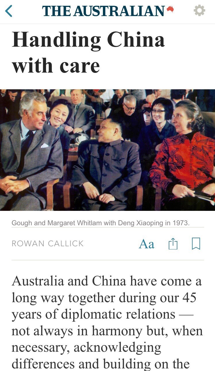 27)在中国与澳大利亚建交45周年前夕,陈弘接受《澳大利亚人报》采访,在题为Handling China with care一文中,陈弘对当前中澳关系所面临的挑战进行分析,并就改善两国关系提出看法。