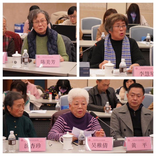 虞苏美先生的同学与好友李慧琴、吴稚倩、陈美芳纷纷回忆了与虞先生共事的岁月,追忆了记忆中先生为人、为师、为学的点点滴滴。与虞先生一起编写《大学英语·听说教程》的李慧琴教授,回忆起与自己相知60年的“闺蜜”与搭档,几度哽咽,泣不成声。吴稚倩教授朗读了她与虞先生共同的精读老师熊家韫所书写的“忆苏美”一文,并追忆了虞先生的治学精神。在虞先生的同学与好友的心目中,虞先生是德才兼备的“女神”,在学识上才高咏絮,汉语英语造诣皆高,唐诗宋词脱口而出,琴棋书画样样精通;在治学上精益求精、极致严谨,“她修改教材从来不留情面,甚至改到只剩下原文的两个字”;在为人处事上又高风亮节,恢廓大度,不图名利,低调谦逊,“我和苏美那么亲,却是在报上看到新闻才知道,她翻译了《三国演义》”;但对于老师、对于学生、对于亲人,甚至陌生人,虞苏美先生都会体恤关怀,出手相助,“当我们得知苏美不幸离去,同学们纷纷在群里面回忆苏美对于自己的帮助,这么多人都视苏美为自己的好友,都受到过苏美的帮助,实在令人惊讶!令人感动!令人敬佩!”