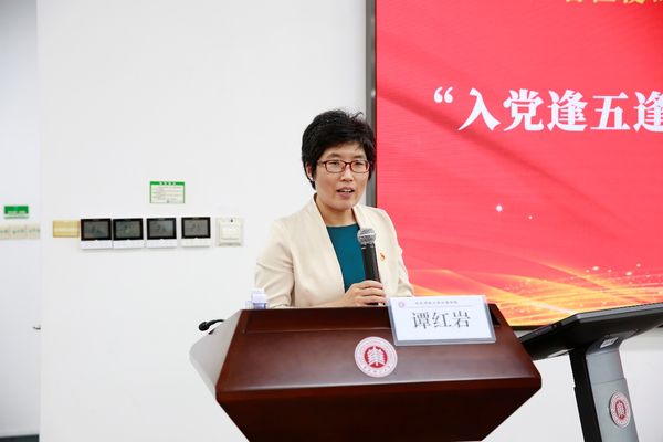 韩春红代表学院党委,向全体党员同志致以节日的问候,并向郁小芬、李道荣、张春龙三位荣获“光荣在党50年”纪念章的老同志表示热烈祝贺。