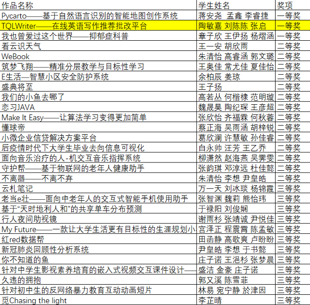 本届比赛从2020年11月至2021年4月,历时共6个月,包括初赛和决赛两个环节,决赛设一、二、三等奖和优胜奖。经过初赛评审,共有来自上海地区的30多所高校的470支队伍进入决赛。在决赛中,每组作品需要进行8分钟的演示讲解以及5分钟的评委问答。决赛答辩中,TQLWriter写作平台的创意以及平台设计得到了评审专家的充分肯定,最终斩获一等奖。