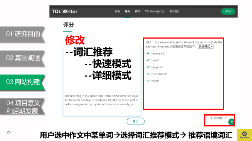 在平台建设过程中,项目团队成员剖析了中国外语学习者的英语写作特点,分析了目前市面上已存在的写作辅助系统的缺陷。同时,团队成员以较为成熟的二语习得理论作为理论基础,引入自然语言处理、机器学习、人工智能等技术,着重解决当前大学生英语写作过程中文本连贯性不足、搭配不当等问题。