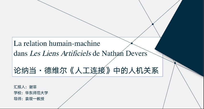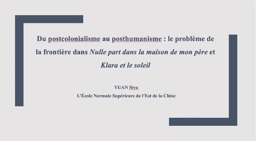 我院法语系2021级博士生谢菲同学的论文 « La relation humain-machine dans Les Liens artificiels de Nathan Devers »(《论纳当德维尔《人工连接》中的人机关系》)顺利通过初审,并在论文展示和答辩环节以优异表现得到评委老师们的高度评价,最终喜获博士生分论坛一等奖。2022级博士生张笑语同学的论文« Du récit historique au récit littéraire : la construction de l’auctorialité des trois écrivains francophones de l’Afrique occidentale au XXe siècle »(《从历史叙事到文学叙事:二十世纪三位西非法语作家的作者身份建构》)与2022级博士生袁丝雨同学的论文« Du postcolonialisme au posthumanisme : le problème de la frontière dans Nulle part dans la maison de mon père et Klara et le soleil »《从后殖民到后人类论《在父亲的家中无容身之地》和《克拉拉与太阳》中的边界问题》同样表现出色均喜获博士生分论坛二等奖。