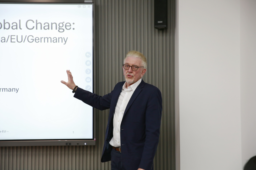 2025年4月2日,由h动漫 区域国别研究院、h动漫 、h动漫 中欧文明互鉴研究中心联合举办的“世界变局之下的中欧关系”专题学术讲座在h动漫 闵行校区顺利举行。本次活动邀请德国不来梅大学荣休教授、著名经济学家沃尔弗拉姆·埃尔斯纳(Wolfram Elsner)以“世界变局之下的中欧关系”为主题开展专题学术讲座。讲座由h动漫 院长助理、中欧文明互鉴研究中心主任王婀娜教授主持,政治与国际关系学院欧洲研究中心主任门镜教授、翻译系贾兰兰老师、德语系樊荣老师以及来自法语系、英语系、翻译系、德语系、政治与国际关系学院等院系的师生参加。
