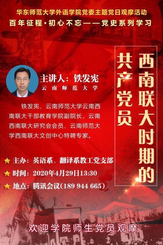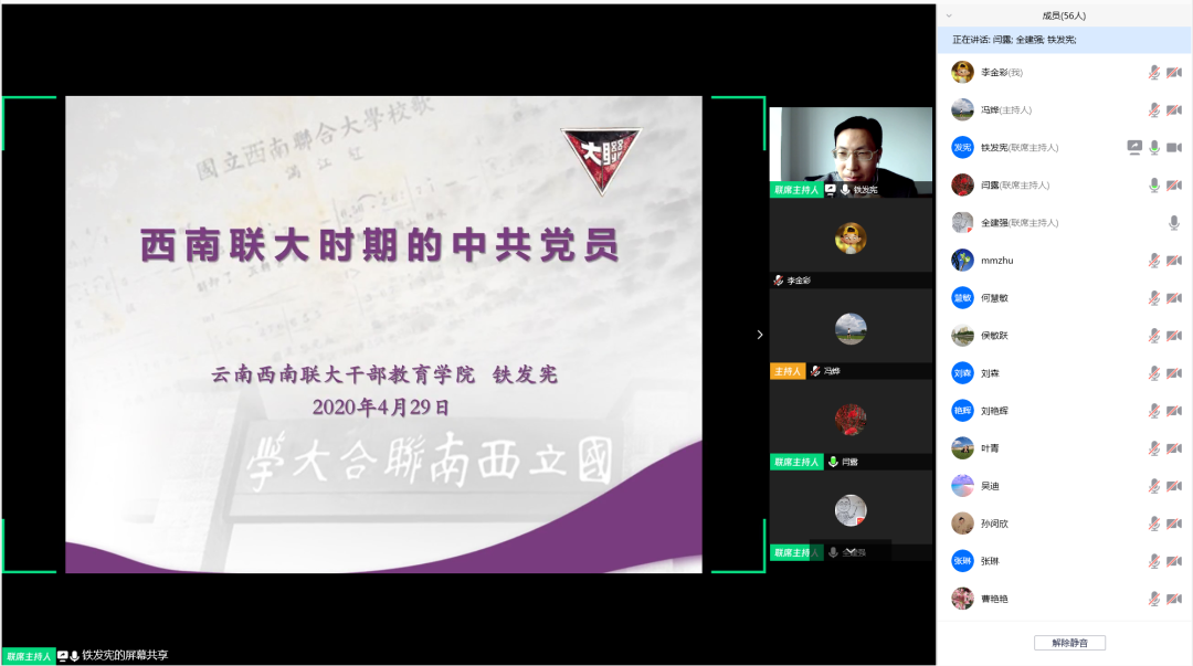 2020年4月29日下午,根据h动漫 党委部署,英语系翻译系联合教工党支部在腾讯会议平台开展了“追寻战火下的西南联大精神,重思疫情中的大学使命”主题党日活动。会议由党支部书记全建强主持,支部党员全体相聚云端;50余名师生党员参加了在线观摩。
