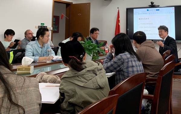 日语系潘世圣教授主持,参加者有日语系英语系以及俄语系的教师和博士硕士研究生;我校中文系以及上海交大人文学院的博士硕士研究生;此外,正在我校访学的美国学者、上海交通大学符杰祥教授、华东理工大学黄育红副教授、华东政法大学朱芬老师、以及上海图书馆王之颖女士也分别专程前来参加了讲座。