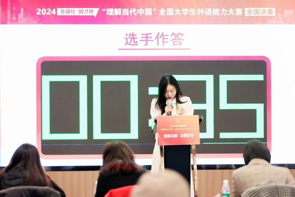 大赛决赛阶段分为即兴演讲、回答问题和汉外口译三个环节。汉外口译环节包括视译题和翻译题两个部分,参赛选手有1分钟的准备时间,之后进行2分钟的口译。段薇薇同学在该环节语言表达流畅准确,内容清晰完整。在即兴演讲和回答问题环节,就《在当今时代该如何分辨善恶是非》这一题目,段薇薇同学首先从时代背景出发,生动阐述了中国新时代青年该如何在纷繁复杂的社会中明辨是非的方式方法,然后从青年人的角度,讲述了中国青年在新时代应如何担当作为。段薇薇同学的演讲语音标准,内容清晰,思想深刻,论述到位,圆满地完成了演讲任务。在两轮比赛中,段薇薇同学稳定发挥,获得了评委们的一致好评,最终荣获银奖。