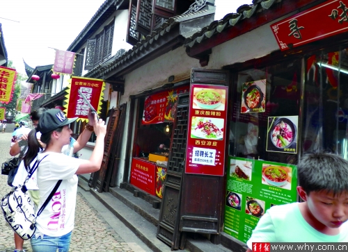 大学生们发现,七宝古镇和朱家角因为外国游客比较多,在一些传统美食店里还可偶见英文菜单。而在嘉定南翔,几乎没有传统美食店里配有英文菜单。