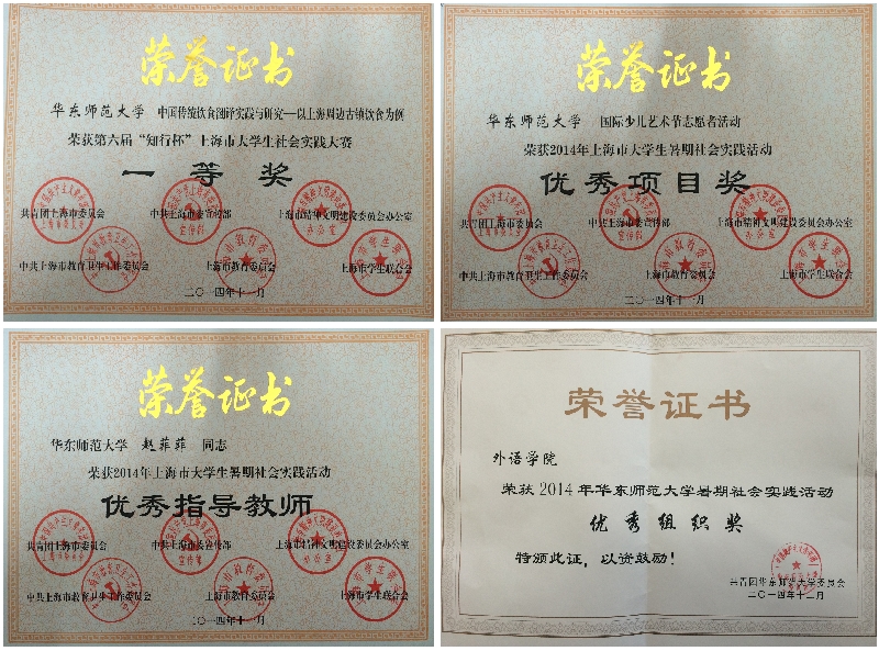 赢得市级、校级多项荣誉。其中《中国传统美食的翻译实践与研究——以上海周边古镇饮食为例》获得上海市第六届“知行杯”一等奖,“国际少儿艺术节志愿者活动”获得2014年上海市暑期社会实践活动最佳项目奖,h动漫