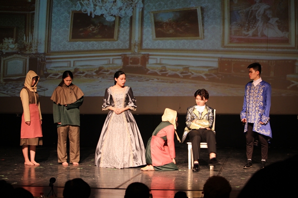 下午一点半,比赛正式开始。来自各个高校的9个剧组依次为大家带来了精彩刺激的表演演出,现场掌声不断。作为比赛的第二个剧目,我院《帕都瓦公爵夫人》剧组闪耀登场,为大家带来了精彩的表演。其中,帕都瓦公爵夫人的扮演者黄子晋同学精湛的演技,让在场的观众拍手叫好。Guido的扮演者姜鹏同学语言掷地有力,演绎了一段人动容的爱情悲剧。公爵的扮演者徐学人更是以他独特的演技,得到了大众的肯定。每位表演者都沉浸在剧中的世界中,认真又投入,与华丽的服装、精心挑选的道具一起,为大家展现了爱尔兰戏剧的魅力,获得了现场观众与评委的一致好评。