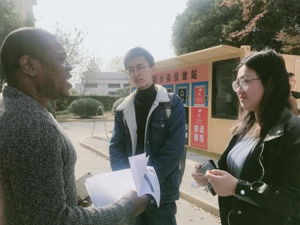 通过采访,我们了解到留学生垃圾分类及环保意识挺强,主动进行垃圾分类,在不懂不会的情况下,会主动询问投放站的工作人员。这些工作人员很热情,对同学们的垃圾分类进行指导和监督,对同学们错误的垃圾分类进行纠正和指导,让同学们对垃圾分类的方法有更深刻的理解和认识。相信我们的垃圾分类资料能帮助他们进一步掌握垃圾分类的知识,形成“自觉分类垃圾,创建美好校园”的良好氛围。