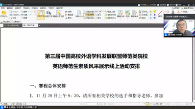 英语系、翻译系党支部书记,外语教学研究中心主任全建强副教授对线上活动的安排做了说明与介绍。在为期两周的时间内,参赛者需根据指定阅读材料展开课堂教学的准备与录制工作,并以视频的方式进行个人才艺的展示。本次活动将持续到2020年12月26日,选手们通过前期的准备将授课资料、视频与才艺展示视频发送至指定平台,经专家团队评审后进行评分与评奖。选手的优秀作品将于后期在平台上发布,供各位同学交流和学习。