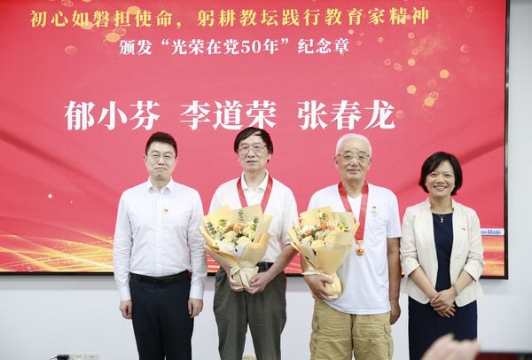 郁小芬、李道荣、张春龙三位党员荣获“光荣在党50年”纪念章。会上,院党委书记韩春红、院长兼党委副书记杨延宁为到场的李道荣、张春龙两位同志颁发纪念章,对前辈们初心不渝、赤诚奉献、勇攀高峰的精神表达最诚挚的敬意和礼赞。