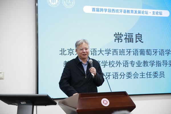 教育部高等学校外语专业教学指导委员会西班牙语分委会主任委员、北京外国语大学常福良教授随后致辞。他强调,在国家加快建设教育强国的大背景下,西班牙语作为重要国际语言,将在全球治理与国家发展中发挥日益重要的作用,因此呼吁西班牙语教育界着眼长远,紧跟时代步伐,加强基础教育阶段的语言培养,打通中学与大学的衔接链条。