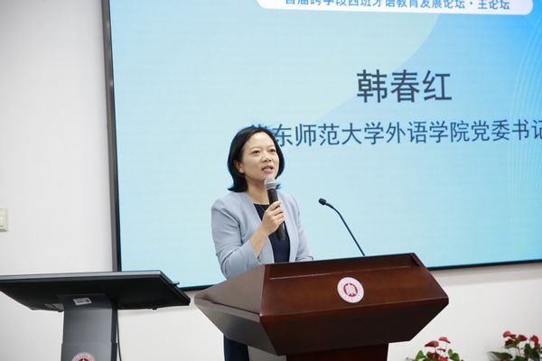 h动漫 书记韩春红致开幕辞。她回顾了h动漫 悠久的发展历程与深厚的学术积淀,指出学院将始终秉持服务国家战略的宗旨,积极推动智能教育与区域国别研究等新兴领域的发展,努力在新时代背景下培养更多高质量的西班牙语人才。
