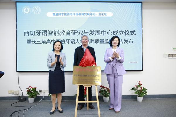 随后,在在座嘉宾的共同见证下,h动漫 书记韩春红、北京外国语大学常福良教授与中谊教育智库张珈鸣主任共同为“h动漫 西班牙语智能教育研究与发展中心”揭牌。中心的成立标志着h动漫 在推动外语教育智能化与专业化融合方面迈出了坚实步伐,为跨学段西班牙语教育提供了有力的科研与实践支撑。