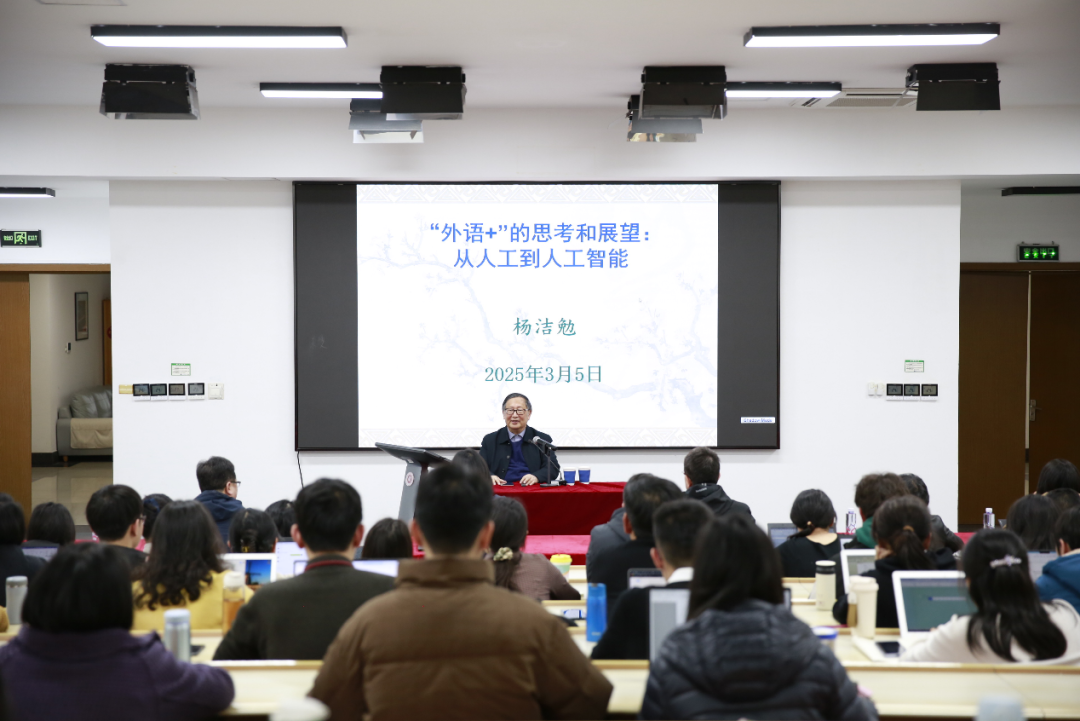 开展2025年首场智能外语教育系列讲坛暨知名校友系列讲坛,特邀上海国际问题研究院前院长、全国高校区域国别学人才培养与学科建设联盟顾问委员会联合主席杨洁勉,以《“外语+”的思考和展望:从人工到人工智能》为主题开展报告。全体教职工、学生党员代表和双语双科实验班学生参加。