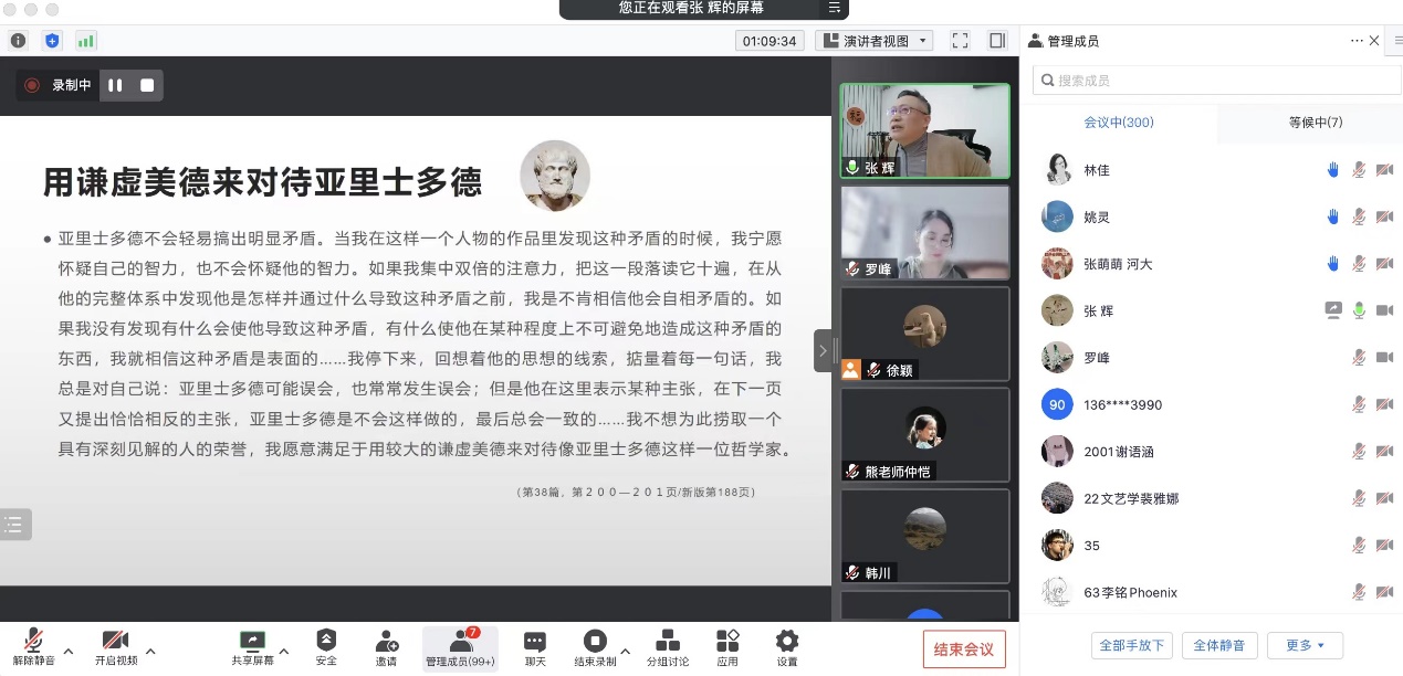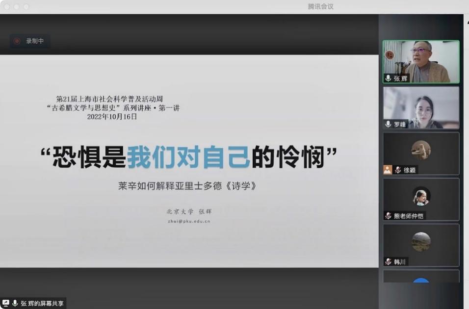 邀请,北京大学比较文学与比较文化研究所所长、教授、博导、中国比较文学学会(CCLA)副会长兼秘书长张辉教授做了题为“‘恐惧是我们对自己的怜悯’:莱辛如何解释亚里士多德《诗学》?”的讲座。本次讲座受第21届上海市社会科学普及活动周资助,是“古希腊文学与思想史”系列讲座第一讲。讲座由英语系罗峰副教授主持,共计300余名校内外师生通过腾讯会议在线参与。