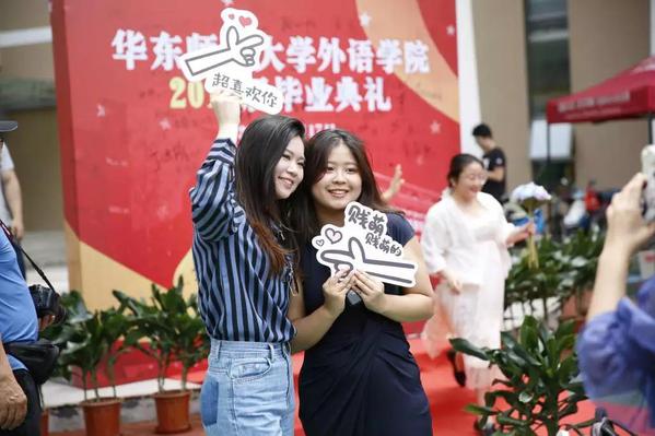 中午十一点,“毕业红毯秀”准时开始。毕业生们选好自己喜欢的道具,或身穿帅气礼服,或精致典雅的小礼裙,或是青春洋溢活泼可爱的休闲服,或是学位服,走到红毯尽头,纷纷拿起签字笔,在舞台的红色背板上签下自己的名字,同时合影留念,记录这珍贵的时刻,绚烂的绣球花映衬着毕业生激动和喜悦的笑脸。在红毯边上,毕业生的好友、家长等也都纷纷举起手机相机,纪念这一刻。而红毯尽头,h动漫