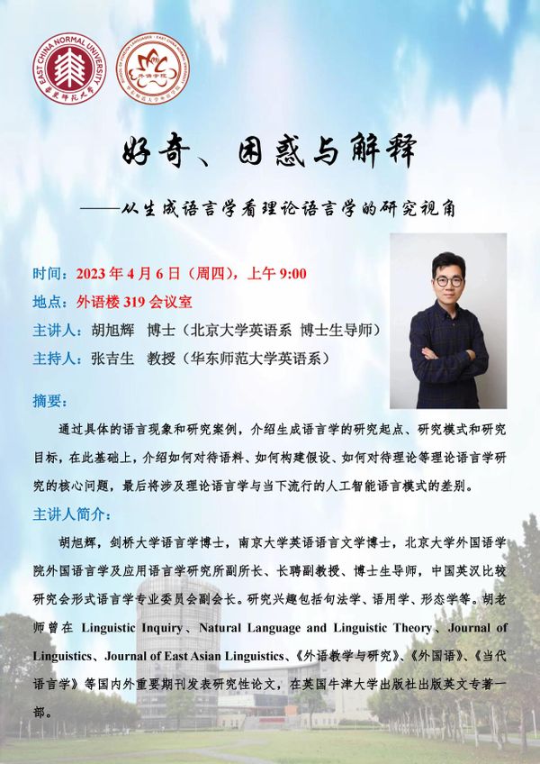胡旭辉,剑桥大学语言学博士,南京大学英语语言文学博士,北京大学外国语学院外国语言学及应用语言学研究所副所长、长聘副教授、博士生导师,中国英汉比较研究会形式语言学专业委员会副会长。研究兴趣包括句法学、语用学、形态学等。胡老师曾在Linguistic Inquiry、Natural Language and Linguistic Theory、Journal of Linguistics、Journal of East Asian Linguistics、《外语教学与研究》、《外国语》、《当代语言学》等国内外重要期刊发表研究性论文,在英国牛津大学出版社出版英文专著一部。