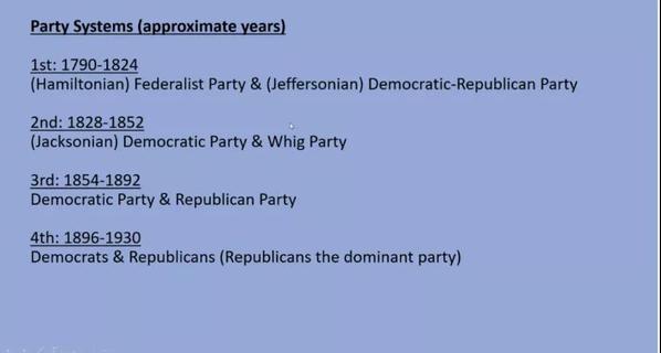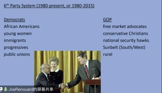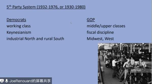 Joe教授还详细介绍了第五、六代政党体系中民主党与“大老党”不同的政治主张(大老党全称“Grand Old Part ”,是共和党的传统昵称,缩写为GOP,该缩写起源于1875年,那时人们将内战中获得英勇胜利的共和党称为“Gallant Old Party”,该词之后演变为“Grand Old Party”,并使得“GOP”这个广泛流传开来。)