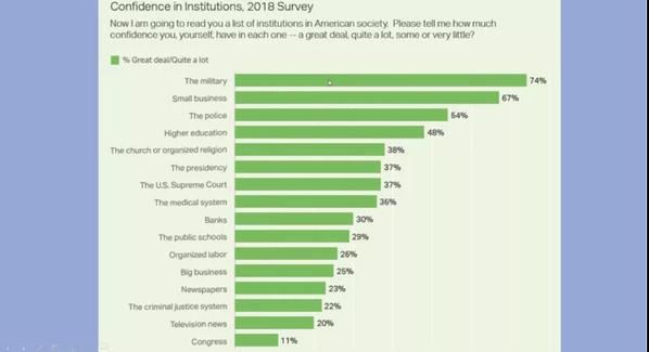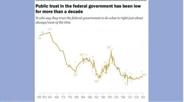 首先,Joe教授佐以简洁明了的图表回顾了从1994年到2017年日益加剧的美国政治的两极化,以及近十年来民众对于联邦政府的较低的信任率。