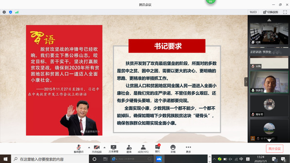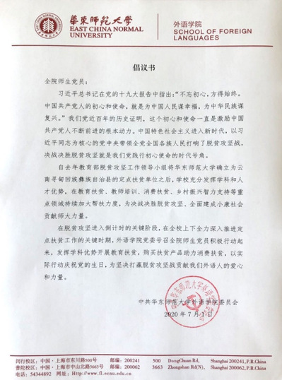 党委积极响应上级号召,于2020年7月1日,开展“助力脱贫攻坚,庆祝建党九十九周年”主题党日活动,号召全院师生党员以实际行动庆祝党的生日,为坚决打赢脱贫攻坚战贡献外语人的爱心和力量。本次活动由学院党委副书记兼副院长江宇靖主持,全院线上线下师生党员120余人参加。