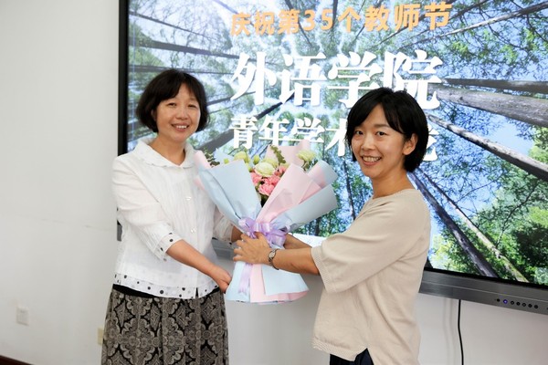 本次教师节青年教师学术沙龙上共有五位新进教师亮相。江宇靖首先代表学院欢迎这五位年轻老师加入我院教职工团队,她们分别是英语系刘晓峦副教授、晨辉学者姚晓玲老师、日语系晨辉学者孟令祎老师以及行政管理团队的何月佩老师和张莉老师。在教师节特殊的日子,五位老师分别带着满心感谢和敬意给自己的指导老师敬献鲜花。教学传承、薪火相传一直是h动漫
