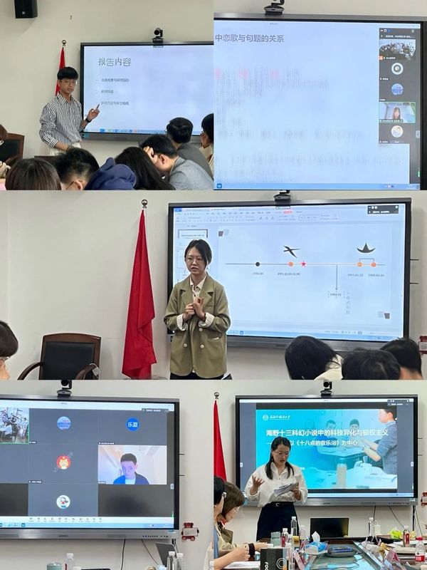 在报告环节,5位博士生分别进行发言。沐海宇报告的题目为“日本江户前期林家交游圈人物的随笔研究”,刘乐夏报告的题目为“中日比较文学视野下的慈圆《文集百首》——以恋歌为中心”,李承坤报告的题目为“‘歧视’的再生产——‘三·一’独立运动时期大众传媒中的‘在日朝鲜人’形象研究”,董悦报告的题目为“近代主义与民族主义之间的‘自我’定位——‘杂种文化论’中的主体性建构与文学关切”,陈瑶报告的题目为“海野十三科幻小说中的科技异化与极权主义——以《十八点的音乐浴》为中心”。