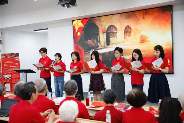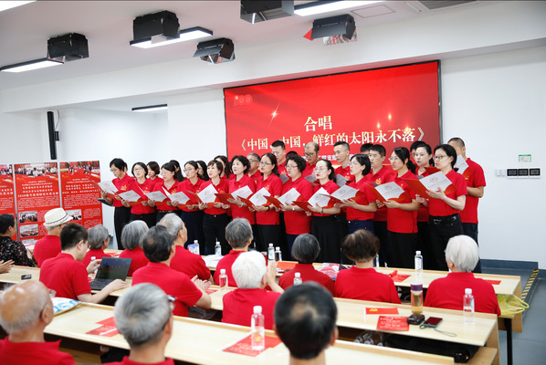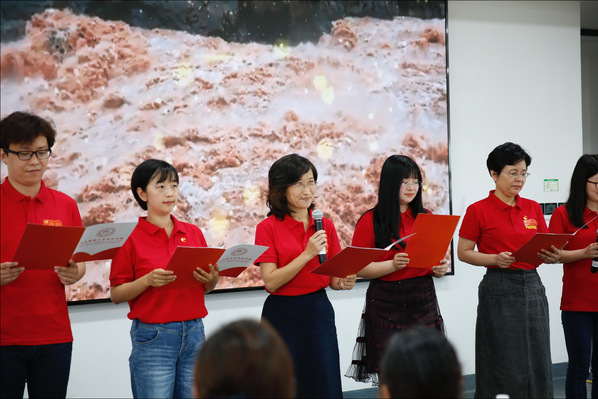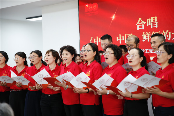 大学英语教学部教工党支部、行政党支部党员以饱满昂扬的激情合唱歌曲《中国,中国,鲜红的太阳永不落》。