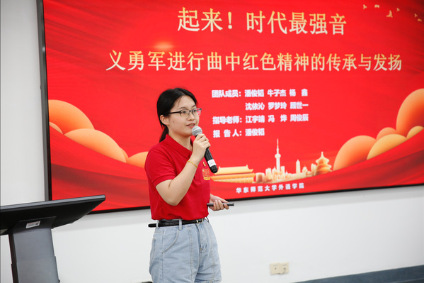 学生党建服务中心负责人、2019级学术型研究生党支部书记潘俊韬汇报展示了挑战杯大学生课外学术科技作品竞赛红色专项全国一等奖作品《起来!时代最强音:义勇军进行曲中红色精神的传承与发扬》,讲述新时代义勇军进行曲的红色精神和价值。