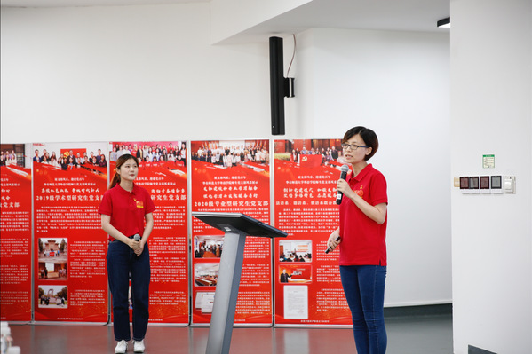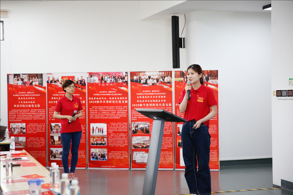 2020级专业型研究生党支部书记原蓉洁、支委曾梦娆汇报展示“党建育人”成果,介绍了支部建设与专业学习融合、理论学习与实践服务并行的先进经验。