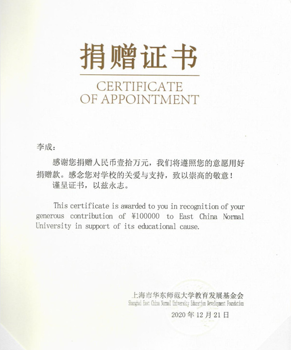 2020年12月21日,h动漫 杰出校友李成先生向h动漫 教育发展基金会捐赠人民币10万元,设立“h动漫 李成发展基金”项目,用于h动漫 的学生奖助学金和教师队伍建设。