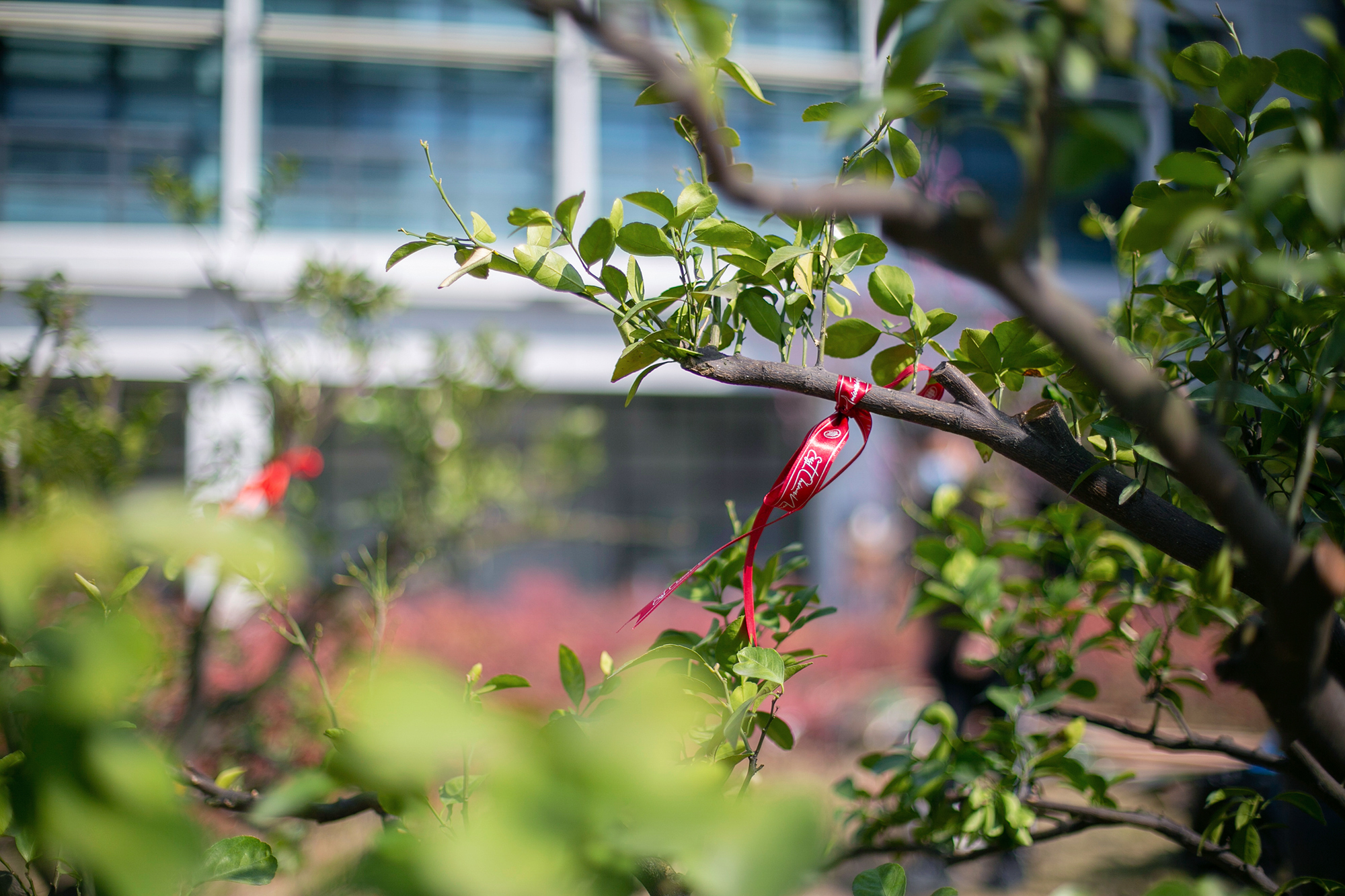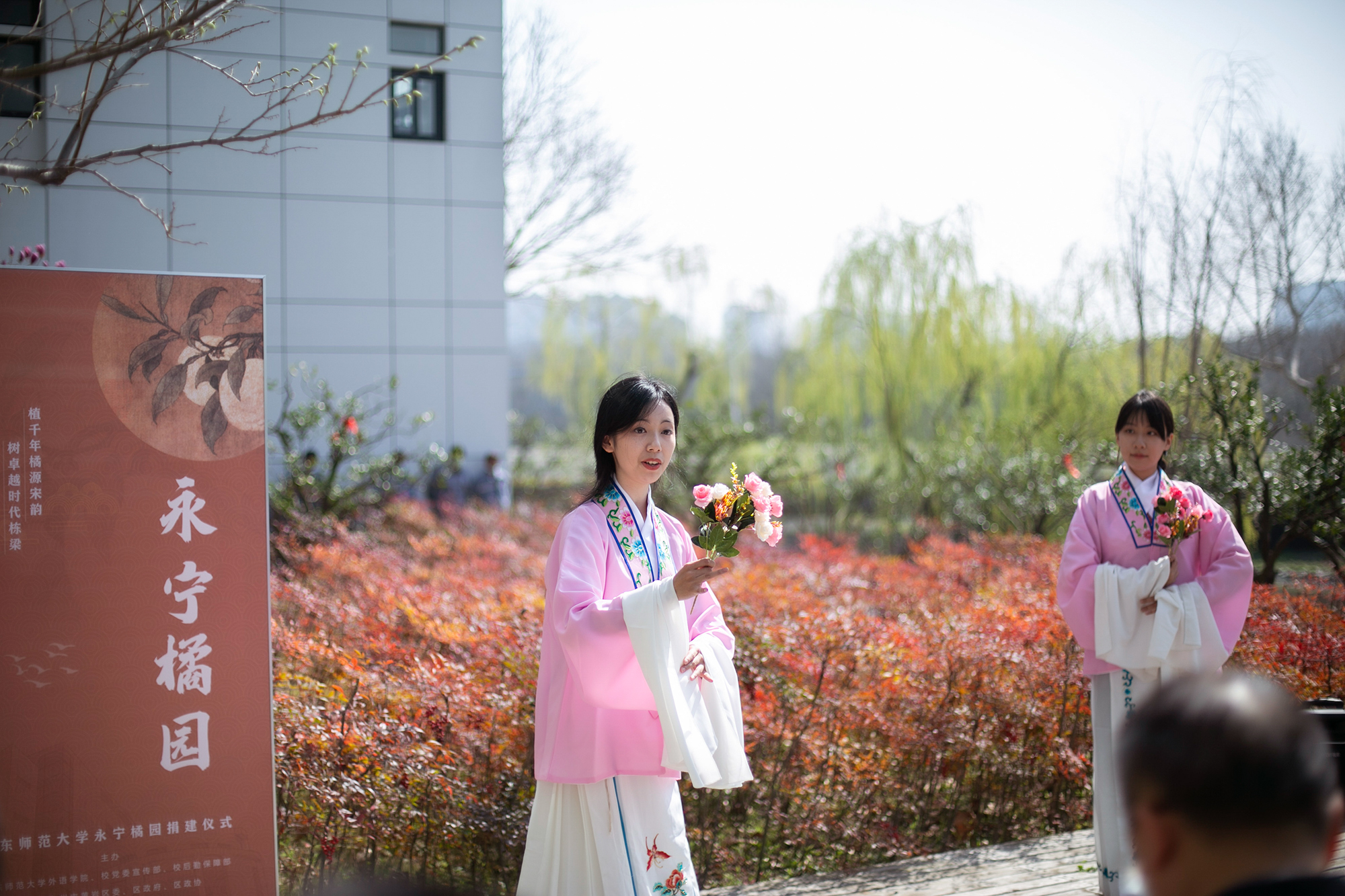 第45个植树节之际,樱桃河畔橘香“流动”。华东师大“永宁橘园”捐建仪式暨植树文化节在闵行校区外语楼樱桃河畔举行。永宁橘园由浙江省台州市黄岩区捐建,占地1700平方米,共70棵橘树,树龄10-15年,品种皆是黄岩当地最正宗的本地早宽皮橘。