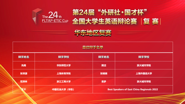 2022年4月9日至10日,第二十四届“外研社·国才杯”全国大学生英语辩论赛华东地区大区赛顺利举办,来自122所高校的244名辩手进行了为期2天、连续5轮辩论的激励比拼。最终,在h动漫 赵朝永教授指导下,我校代表队选手马心怡(2021级外国语言学及应用语言学专业硕士研究生)和先雨(2019级英语专业本科生)总积分在122个队伍中排名第7名,取得华东地区赛“一等奖”的好成绩,晋级全国总决赛。与此同时,先雨同学还获得了“最佳辩手”的荣誉称号(244位选手中共评选7位)。