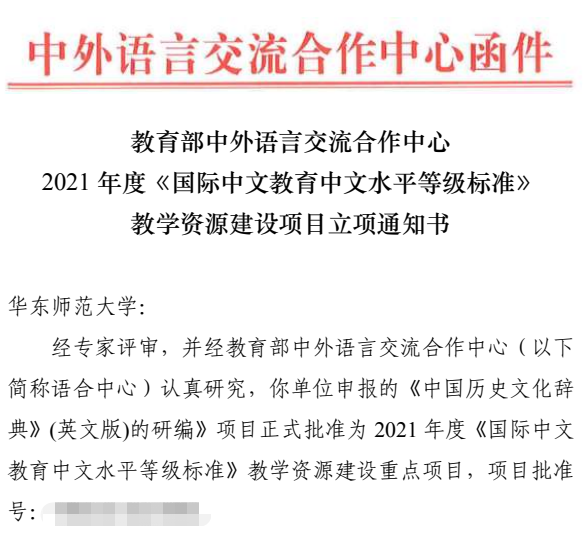 经专家评审,并经教育部中外语言交流合作中心认真研究,华东师大h动漫 赵刚教授申报的《中国历史文化辞典》(英文版)的研编》项目正式批准为 2021 年度《国际中文教育中文水平等级标准》教学资源建设重点项目。