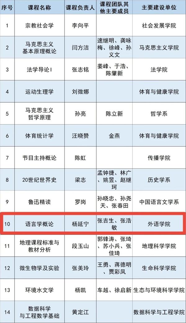 日前,教育部公示了第二批国家级一流本科课程认定结果,h动漫 入选42门。其中,由我院杨延宁教授领衔、张吉生、张浩敏教授加入课程团队的《语言学概论》入选国家级一流本科课程(线下一流课程)。