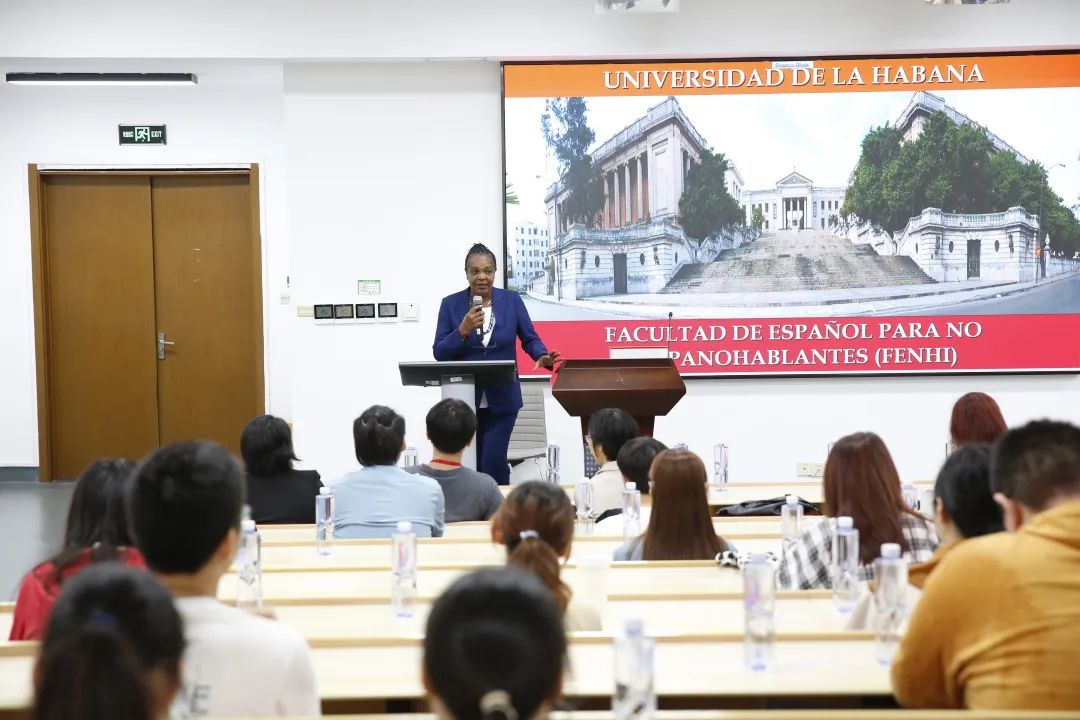 5日上午,哈瓦那大学代表团再次莅临h动漫 ,与我校西班牙语专业师生举行交流活动。哈瓦那大学西班牙语学院院长Lidia Cuba博士为师生做哈瓦那大学介绍及交流项目宣讲。
