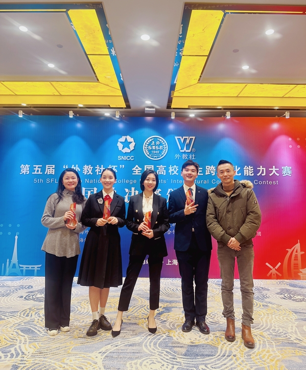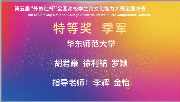 李辉、金怡指导校学生团队荣获第五届“外教社杯”全国高校学生跨文化能力大赛总决赛特等奖(季军)。